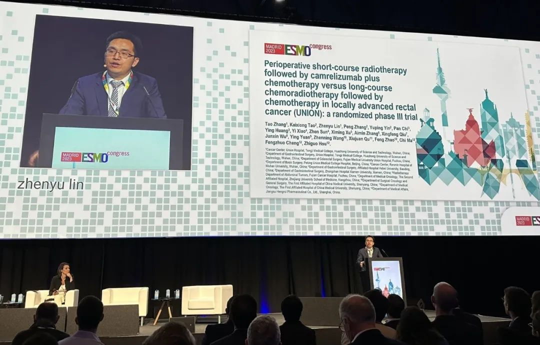 10月21日,东升国际医药创新药卡瑞利珠单抗的一项研究“新辅助短程放疗序贯卡瑞利珠单抗联合化疗对比长程放化疗序贯化疗治疗局部晚期直肠癌”随机对照Ⅲ期试验(UNION)亮相2023 ESMO大会优选口头报告现场。该研究由华中科技大学同济医学院附属协和医院张涛教授、陶凯雄教授担任主要研究者,华中科技大学同济医学院附属协和医院林振宇教授在大会现场报告了该重磅研究的结果1。此项研究是全球首个评估短程放疗序贯免疫治疗联合化疗治疗局部晚期直肠癌的Ⅲ期研究,已达到主要终点病理完全缓解(pCR),有望为直肠癌患者的治疗提供新策略。