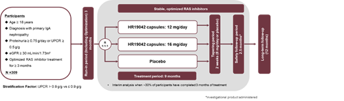 本研究为随机、双盲、安慰剂平行对照、多中心设计的Ⅱ/Ⅲ期临床试验,旨在评价在RAS阻滞剂治疗基础上,HR19042胶囊相较于安慰剂治疗原发性IgA肾病的有效性和安全性。试验计划随机309例原发性IgA肾病受试者,在RAS阻滞剂稳定治疗基础上接受HR19042胶囊9个月治疗,随访至首次给药后24个月。