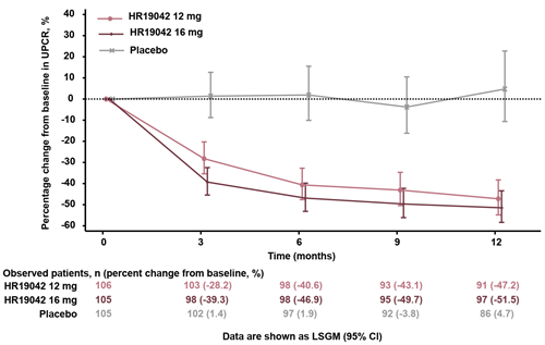 本研究达到所有主要终点,HR19042胶囊12mg、16mg均可显著降低尿蛋白,并能有效延缓肾功能下降,且安全性与耐受性良好。